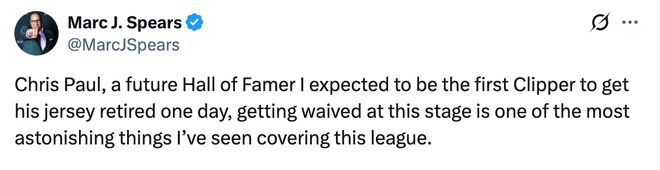 NBA名记马克-J-斯皮尔斯写道:克里斯-保罗是未来的名人堂成员,我原本以为他会是快船第一个退役球衣的选手,没想到快船在这个阶段裁掉他,这太令人觉得不可思议了。