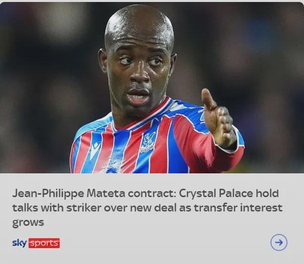 28岁的马特塔本赛季已经在11场英超比赛中打进6球,这名前锋最近入选了法国国家队,并且在出战的前3场比赛中打进2球。至今为止,马特塔总共在代表水晶宫出战的171场比赛中打进54球。